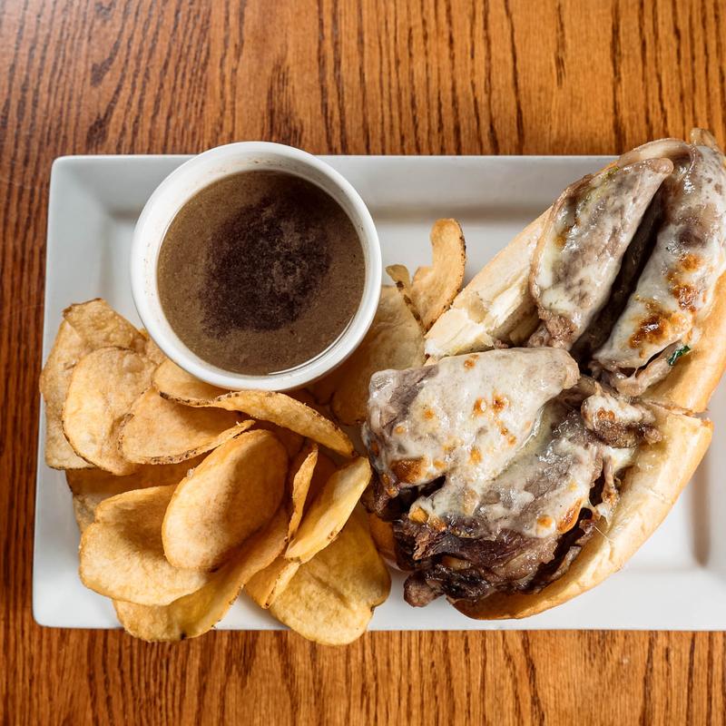 Hand Carved USDA Choice Prime Rib, Swiss cheese, grilled onions & au jus on a long roll